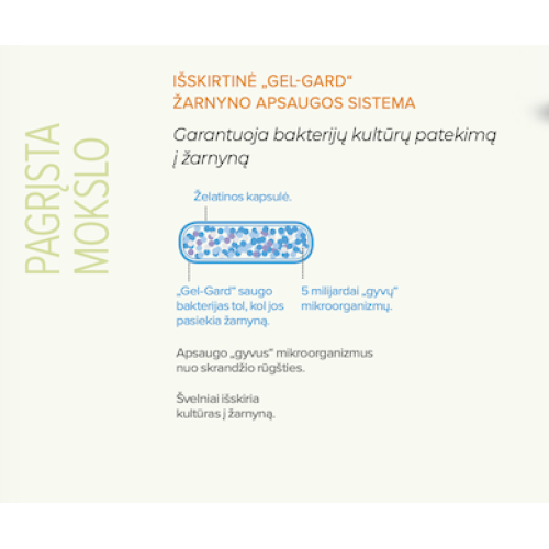 Originalus mišinys: Lactobacillus acidophilus, Lactobacillus delbrueckii bulgaricus, Lactobacillus paracasei, Bifidobacterium animalis ir Streptococcus thermophilus. Ypatinga „Gel-Gard” apsaugos sistema garantuoja bakterijų patekimą į žarnyną, apsaugodama jas nuo agresyvios skrandžio rūgšties. Taip užtikrinama, jog į žarnyną pateks maksimalus bakterijų skaičius. .